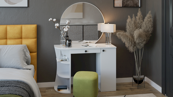 Стол туалетный с использованием белой гладкой текстуры, подойдет к интерьеру, выдержанному в современном стиле, и станет отличным решением для обустройства уголка красоты дома или квартиры.