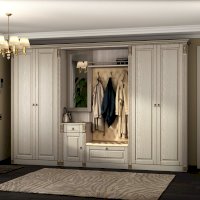 Прихожая выполнена в классическом стиле с декоративными элементами. Фасады и декоративные элементы патинированы, патина наносится вручную, по классической итальянской технологии и защищена матовым лаком. Мягкие элементы (вешалка и сиденье) выполнены из экокожи, декорированы каретной стяжкой.