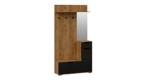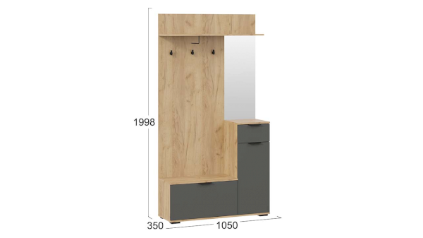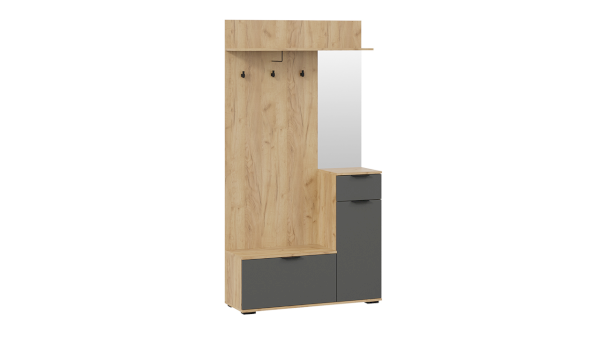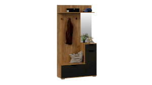 При своей небольшой глубине прихожая «Эвита» является функциональной мебелью, ведь в её конструкции предусмотрены: открытая секция с крючками и штангой для одежды в цвет лицевой фурнитуры, компактное зеркало, открытая верхняя полка, на которой можно расположить головные уборы и закрытые ниши, в которых можно спрятать от посторонних глаз все необходимые предметы.