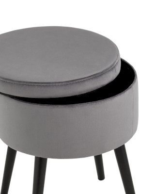 Компактный пуф с ящиком в лаконичном стиле. Мягкая обивка выполнена из износостойкого велюра, тактильно приятный и долговечный материал. Металлические ножки черного цвета высотой 26 см выдерживают нагрузку до 80 кг. Под сидением имеется ящик для хранения мелочей, крышка полностью съемная. Подпятники в основании ножек делают пуф более устойчивым и предотвращают скольжение.