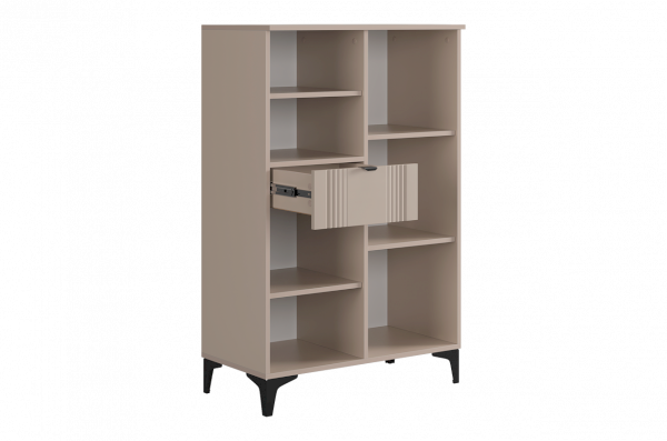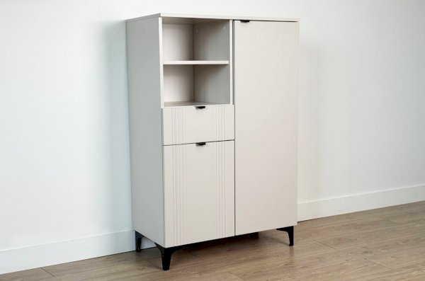 Дизайн комода продуман до мелочей: с одной стороны расположена глухая дверца, за которой скрывается просторное пространство для хранения. С другой стороны – ниша с открытой полкой, выкатной ящик и ещё одна глухая дверца, что позволяет гибко организовать хранение и поддерживать порядок в доме.