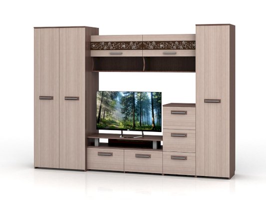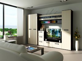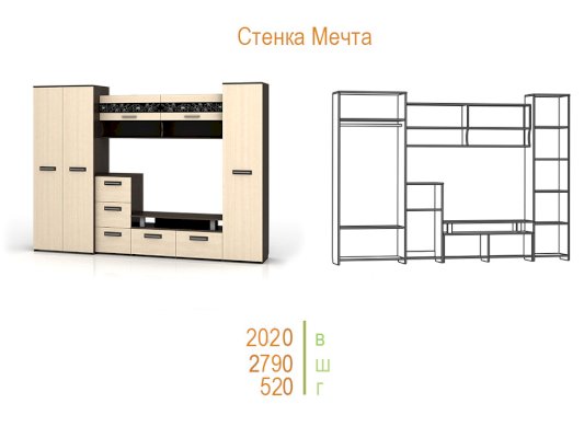 Стенка Мечта - прекрасное решение для гостиной. Сочетает в себе различные по функциональности модули, а декор из стекла добавляет контраст и оригинальность.