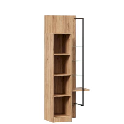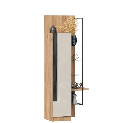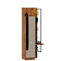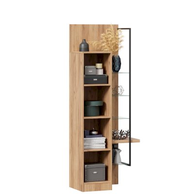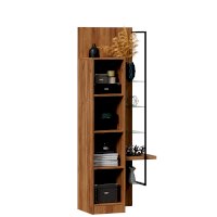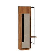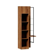 - Шкаф правый визуально разделен на две части – непосредственно шкаф (350х1500х391 мм) с 3 полками ЛДСП за распашной дверью (открывается всегда направо) и секцию с открытыми полками: 4 стеклополки (223х330 мм) и 1 полка из ЛДСП 32 мм (350х334 мм) – и декоративным металлическим кронштейном.
