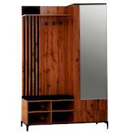 В шкафу есть открытая секция с тремя металлическими крючками, чтобы повесить верхнюю одежду. Ниже предусмотрен мягкий элемент, чтобы можно было присесть и снять обувь или просто поставить сумку. В закрытой секции - выдвижная штанга и шляпная полка. Выдвижная штанга выдерживает вес до 16 кг. Снизу предусмотрены два вместительных выдвижных ящика с шариковыми направляющими. Ящики можно использовать для хранения обуви и обувных аксессуаров.