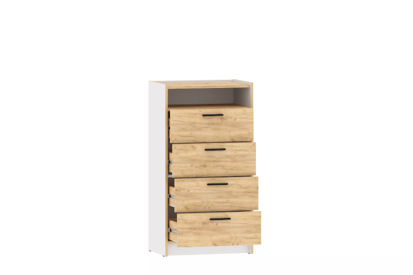 Комод оснащен четырьмя выдвижными ящиками, которые открываются плавно и бесшумно благодаря шариковым направляющим, открытой нишей для удобного хранения вещей, а также представлен в двух размерах, чтобы точно уместиться в параметры вашей комнаты. Черные ручки комода гармонично контрастируют с песочным оттенком фасада.