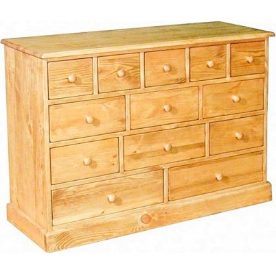 Широкий комод-тумба с множеством ящиков различного размера. Этот комод будет удобен и для мелочей в спальне, и для кухонных принадлежностей. Небольшая высота делает его возможной заменой телевизионной тумбе. Донышки ящиков набраны из сосновых дощечек. В конструкции нет элементов из ДСП или фанеры.