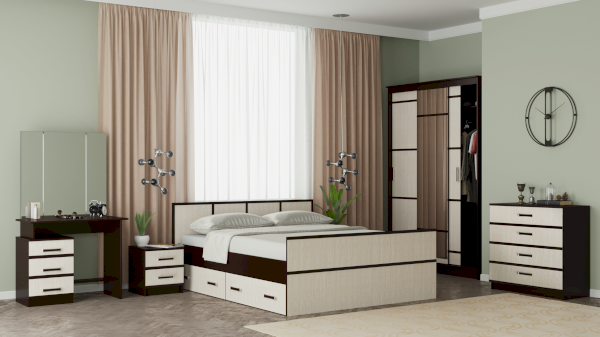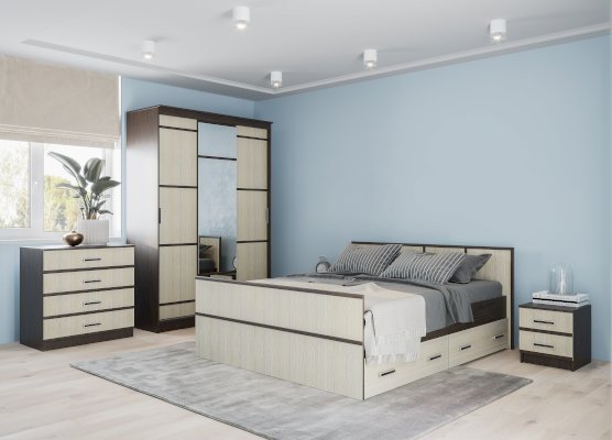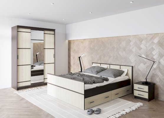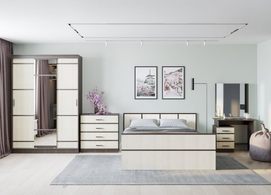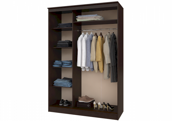 Шкаф-купе Сакура выполнен в едином стиле с остальными модулями одноимённой мебельной серии. Он сделан из ЛДСП высокого качества в комбинации цветов венге и лоредо, раздвижные дверцы декорированы темными полосами и дополнены удобными ручками, центральная створка – полностью зеркальная. Внутри модель содержит все необходимые зоны для хранения одежды и обуви: большое отделение для плечиков, а также полки и ниши для остальных вещей.